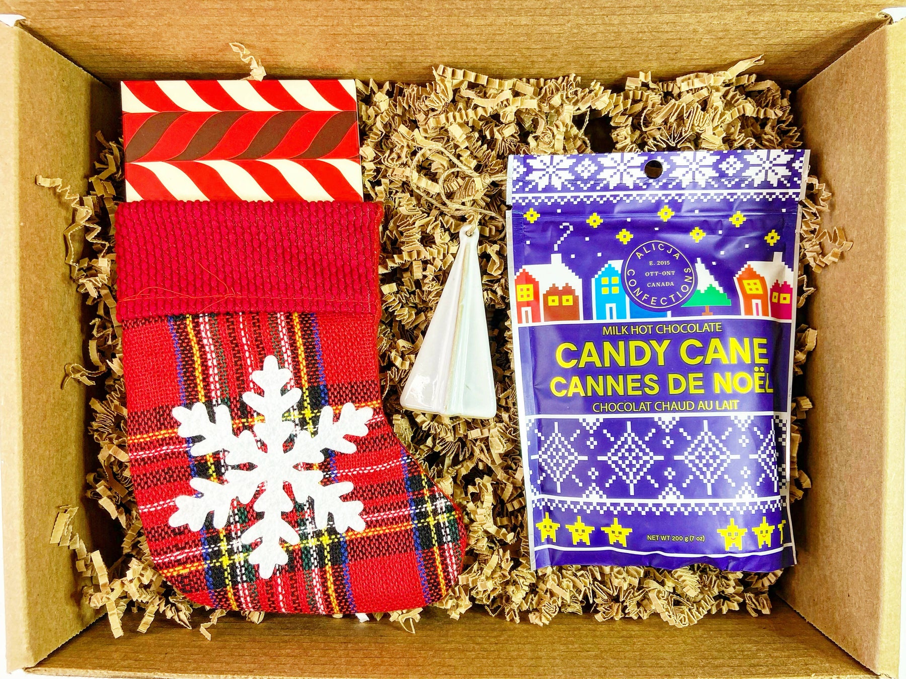 This Local Holiday Gift box includes Candy Cane Hot Chocolate from Alicja Confections, a Peppermint Bark Postcard Chocolate Bar from Alicja Confections, a Decorative stocking, and a beautiful ceramic Christmas tree ornament. It's all wrapped up with a decorative ribbon and festive decoration.